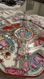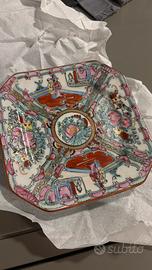 Piatto in porcellana cinese Canton "famille rose" con decorazione policroma di fiori e scene tradizionali. Forma ottagonale, dettagli in rilievo e colori vivaci (rosa, verde, azzurro, rosso). Vintage in buone condizioni (segni del tempo normali). Ideale per collezionisti o arredamento elegante.