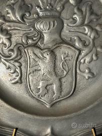 Antico piatto araldico in peltro, di manifattura tedesca, caratterizzato da