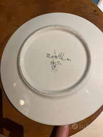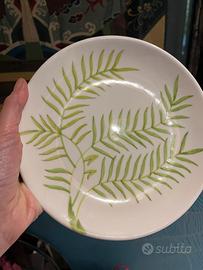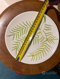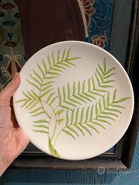 Piatto da Collezione Firmato – Decoro Felce Botanica – Dipinto a Mano – ITALY – 21cm Descrizione In vendita un raffinato piatto circolare da collezione, pezzo d'arte ceramica dipinto a mano. • Design e Decoro: Caratterizzato da un elegante e fresco decoro botanico raffigurante tre fronde di felce stilizzate nei toni del verde pastello e verde muschio, su fondo bianco lucido. Un design che evoca la natura con grazia e minimalismo. • Firma e Autenticità: Il retro del piatto presenta una firma manoscritta di difficile interpretazione (probabilmente "M. d'Arte" o "M. O...te"), chiaramente seguita dalla dicitura "ITALY" e da un codice numerico (probabilmente di serie o data, es. "12/91"), a garanzia della manifattura artistica italiana. • Periodo stimato: La fattura e il design suggeriscono una produzione artistica italiana degli anni '90 (coerente con il codice "91" sul retro). • Condizioni: Eccellenti. La superficie è integra, priva di sbeccature, crepe o restauri. Lo smalto conserva la lucentezza originale. Si prega di visionare le foto dettagliate per apprezzare lo stato dell'oggetto.