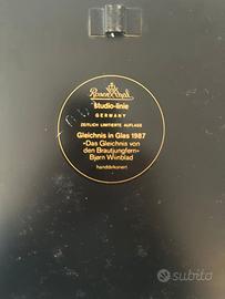 Piatto da parete in vetro artistico sfaccettato e smerigliato montato su supporto metallico laccato nero con decorazioni dorate raffigurante la parabola del Vangelo " Le damigelle dorate". Bjørn Wiinblad Tipologia: Arte moderna e contemporanea Anno 1987 31x31x2 cm Collezione privata Presenta normali usure del tempo ma nel complesso in ottime condizioni