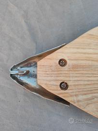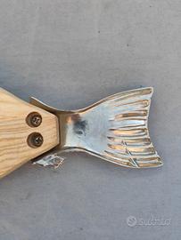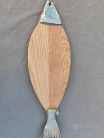 vendo piatto da portata o tagliere a forma di pesce, realizzato in legno con dettagli in metallo sulla testa e sulla coda. misura 60x20