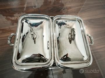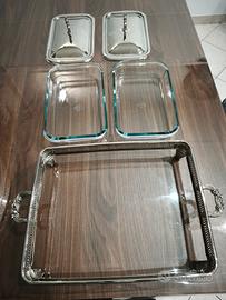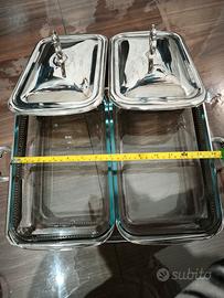 Ecco un meraviglioso set doppio di teglie da forno e da portata di Marinex, prodotto in Brasile. Include due teglie rettangolari in vetro resistente al calore, ciascuna inserita in una struttura in acciaio inox lucido con manici laterali e coperchi a cupola coordinati. Elegante e pratico, questo design di metà secolo è ideale per buffet, presentazioni di piatti caldi o pasti dal forno alla tavola. I vassoi rimovibili sono perfetti anche come eleganti contenitori o centrotavola. Un'aggiunta elegante a qualsiasi cucina o tavolo da pranzo vintage.