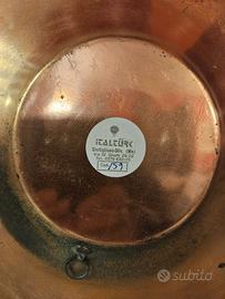 Elegante piatto decorativo italiano realizzato in rame con ricca decorazione policroma e motivo floreale e geometrico di ispirazione orientale/moresca. Il decoro è disposto in forma radiale e presenta una lavorazione accurata e armoniosa tipica della produzione artistica ITALTURK del secondo dopo guerra. Il piatto nasce esclusivamente come oggetto da parete come confermato dal gancio originale sul retro e dalla etichetta del produttore ITALTURK- Castiglione delle Stiviere (MN) ancora presente. Oggetto di grande impatto decorativo, ideale per arredamento vintage, collezionismo di arte decorativa italiana o ambienti eclettici. Materiali e tecnica: supporto in rame, decorazione policroma applicata (smalti/ tessere decorative), bordo inciso. Condizioni: in buone condizioni generali con normale patina del rame coerente con l’età. Non si segnalano rotture o mancanze evidenti nella decorazione. Nota per i collezionisti: La produzione ITALTURK è apprezata per la qualità artigianale e per il gusto decorativo tipico del design italiano anni 50-70. Pezzo rappresentativo della manifattura di dimensione superiori alla media. Diametro 29 cm peso 400 grammi