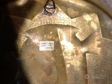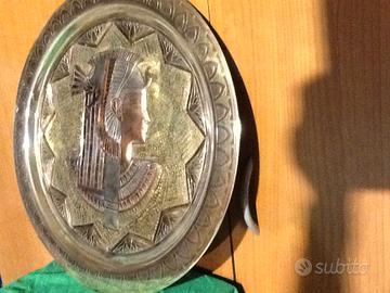 Vecchio piatto decorativo Egiziano degli anni 60,in Ottone e Rame, forgiato e finemente lavorato a mano, diametro 50 cm circa,raffigurante un busto Faraonico