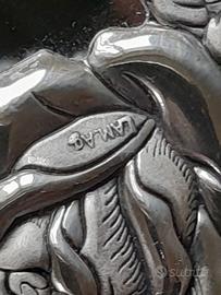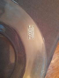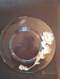 Piatto decorativo in vetro eseguito secondo la tecnica dei maestri di Murano, con decorazione a forma di rosa, in argento laminato, lungo il bordo. Dimensioni diametro cm 22. Articolo vintage, nuovo, nella scatola originale.