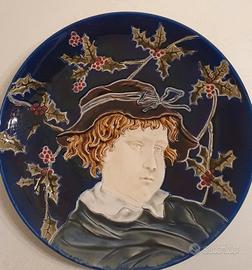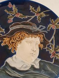 Vendo splendido piatto decorativo da parete in ceramica smaltata vintage. Un pezzo di grande carattere, lavorato con tecnica ad altorilievo. Caratteristiche e Condizioni: Decoro: Raffigura un ritratto classico in rilievo incorniciato da rami di agrifoglio con bacche rosse, il tutto esaltato da un bellissimo e profondo sfondo blu cobalto. Condizioni: Ottime. I colori sono vividi e lo smalto è lucido e privo di sbeccature. Segnalo la presenza del fisiologico "craquelure" (le leggerissime e naturali micro-crepe superficiali dello smalto trasparente, visibili ad esempio sul colletto bianco da vicino), un dettaglio che certifica l'autenticità e l'epoca vintage della ceramica. Utilizzo: Bellissimo da appendere a parete o da esporre su un supporto per piatti. Ideale per arredamenti classici o come suggestiva decorazione di classe. Ritiro a mano a Torino (zona Santa Rita) Disponibile per altre foto Prezzo trattabile