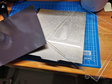 piatto di stampa 3d riscaldato magnetico 31cm x 31 cm a 12 Volt proveniente da una Creality CR-10. comprendo piano in Pei textured nuovo Prima, piano in vetro borosilicato, piano magnetico adesivo di ricambio e un piano in PEI liscio usato.