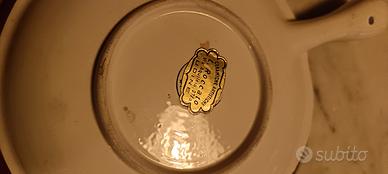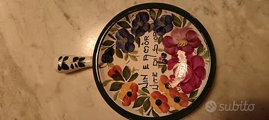 Piatto con manico, da appendere ma anche per servire antipasti i. Ceramica decorata tipica friulana con scritta "VIN E AMOR VITE DI SIOR" (... come dargli torto!). Il piatto è sempre stato conservato in un cassetto, mai usato!