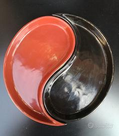 Piatto Giapponese di ceramica diviso in 2 fatto a forma di simbolo dello ying e dello yang , la filosofia cinese, che rappresenta due forze opposte e complementari che si integrano e si completano a vicenda, formando l'armonia dell'universo. Vendo praticamente mai usato solo per esposizione
