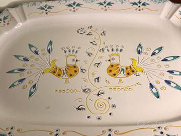 Il piatto misura 44x31 cm ed è decorato con il motivo tradizionale della pavoncella, simbolo di buon auspicio nella cultura sarda.