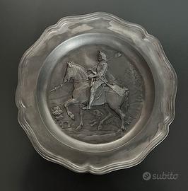 Questo antico piatto decorativo è realizzato in peltro, una lega metallica in passato utilizzata per piatti ornamentali di produzione europea, in particolare tedesca. Rappresenta una famosa incisione del 1513 di Albrecht Durer (Il Cavaliere, la Morte e il Diavolo) ed è stato realizzato da Jope Center Haus, una azienda rinomata per la produzione di piatti, boccali e decorazioni da parete in peltro (Zinnin tedesco), spesso caratterizzati da bassorilievi che riproducono opere d'arte classiche o scene storiche europee. Gli oggetti firmati Jope Center Haus sono solitamente realizzati inpeltro fuso, rifiniti con una patina scura per esaltare i dettagli del rilievo, come quello del cavaliere di Dürer, simbolo di rettitudine morale e forza. Il punzone98%impresso nel metallo certifica una purezza del peltro molto elevata, che rende il piatto più "nobile", più pesante conferendogli una lucentezza che ricorda l'argento. La combinazione tra le grandi dimensioni (30 cm di diametro è una misura importante per un piatto da parete), il soggetto iconico di Dürer e l'altissima percentuale di stagno lo rende un pezzo da collezione superiore alla media. Diametro 30 cm - Altezza 2,5 cm