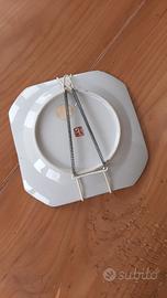 Piatto in porcellana cinese finemente decorato a mano con motivi policromi, simboli di buona fortuna. Di forma quadrata con angoli smussati. Misura cm 20.5