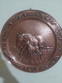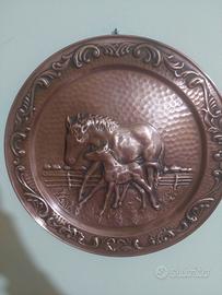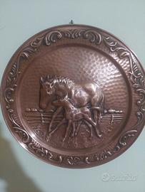 Vendo piatto decorativo vintage in rame sbalzato, raffigurante cavalla e puledro in rilievo.