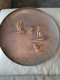 grande piatto decorativo da parete in rame sbalzato 43 cm lavorazione artigianale. vintage con raffigurazione anatre in volo.