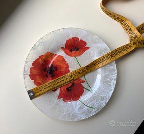 Un piattino in vetro decorato con papaveri, trattato con tecnica decoupage