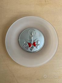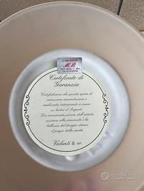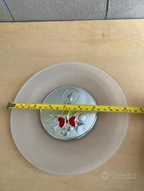 Piatto in vetro soffiato con decoro centrale in ARGENTO candela natalizia in argento certificato come si puó federe in Foto con certificato di garanzia sul retro e sul davanti il marchio Arg 101 !! Nuovo idale anche da appendere!! Diametro 21 cm!! Ottima idea regalo per le feste di Natale!! In argento