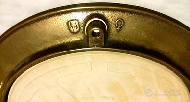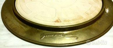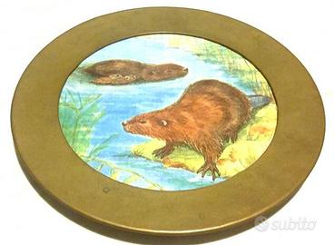 Vecchio Piatto Inglese in Ottone raffigurante la famiglia di castori dipinto e laccato su ceramica tonda. Il piatto è incorniciato con cornice in ottone antichizzato, sul retro "stemma inglese" e "simbolo di sesso femminile", inoltre alla base del piatto la firma dell'autore. Il piatto in ceramica è una pittura che rappresenta castori, sono pitture eseguite a mano protette dalla lacca trasparente.
