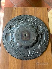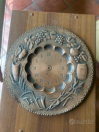Vendo piatto circolare per orologio da parete in rame lavorato a sbalzo, risalente agli anni '70. Soggetto: Scena rustica contadina con uva, botti di vino e attrezzi agricoli. Lavorazione: Rame con finitura brunita e lavorazione "martellata" nel quadrante centrale. Numeri romani in rilievo. Condizioni: Ottime condizioni estetiche, bella patina del tempo. Nota: Il piatto viene venduto senza meccanismo e senza lancette (ideale per un progetto di restauro o come decorazione murale).