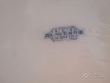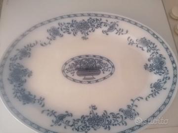 piatto da portata ovale in ceramica , caratterizzato da un motivo decorativo floreale blu su sfondo bianco, riconducibile ai primi del secolo scorso vecchia Laveno (vedi timbro dietro) Stile: Decorazione a trasferimentocon motivi floreali e un cesto centrale. Uso: Oggetto da collezione o elemento decorativo per la tavola.