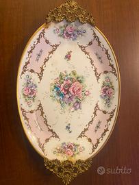 /PIATTO OVALE ROMANTICO IN PORCELLANA DI LIMOGES CON MOTIVI FLOREALI, ROSA, CON MANICI IN OTTONE, ANTICO BURROUGHS