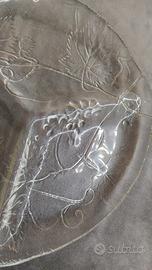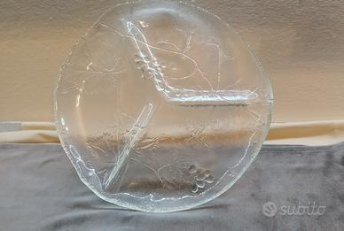 Bel piatto per antipasti suddiviso in tre scomparti In vetro pesante con decoro a tralci di vite. Diametro massimo cm 34. Condizioni perfette
