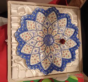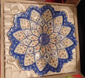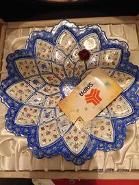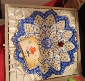 Questo oggetto è unpiatto artigianale persianodecorato con la tecnicaMinakari. Tecnica: Si tratta di una forma d'arte iraniana che prevede la smaltatura e la pittura su metallo, solitamente rame, che viene poi cotto in forno per fissare i colori. Caratteristiche: Il piatto presenta complessi motivi floreali o geometrici, con colori vivaci come il blu intenso, spesso utilizzato come base. Uso: È principalmente unoggetto decorativodi alto artigianato.