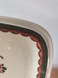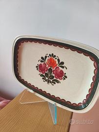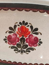 I fiori al centro sono dipinti a mano e c'è un fiore rosso al centro con due fiori borgogna circondati da foglie verdi. Lungo la lunghezza del piatto c'è un motivo a cappette dipinto a mano.
