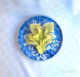 #Piatto decorativo parete / piatto dessert , svuota tasche, base per candela , decorato con fiori di giglio bianco blu porcellana limoges ,