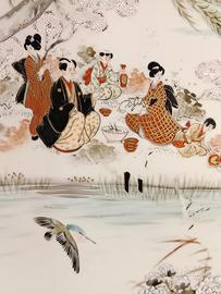 L'opera presenta una complessa scena dipinta a mano raffigurante una famiglia giapponese in un paesaggio lacustre, con il Monte Fuji sullo sfondo.