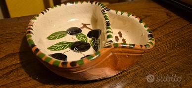 Piatto porta olive in ceramica decorata a doppio scomparto per noccioli, dimensioni cm.20 x 17.