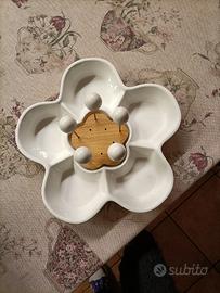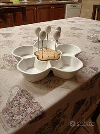 Vendo simpatico piatto per offrire salse diverse o piccoli aperitivi ai tuoi ospiti, corredato di 5 "stuzzicadenti" di metallo per infilzare eventuali bocconcini. Usato pochissimo