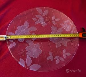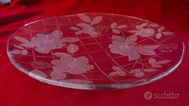Piatto da portata in vetro trasparente lavorato a disegni floreali. Diametro cm 35