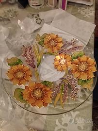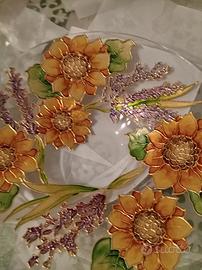 Piatto cm 40 rialzato. Vetro di buona manifattura con decorazione girasoli e lavanda ispirato ai campi francesi di Valensole. Dipinto e disegnato a mano su foglia d'oro 24 carati. Smalti resistenti alla usura si può lavare con acqua e sapone da piatti o sgrassatore semplice. Ottimo come oggetto da arredamento che per uso pratico, caramelle, biglietti, fiori profumati, altro. Pezzo unico, nuovo mai usato solo pulito e controllato quasi imballato. Se problemi si può al momento replicare. Può essere anche un idea regalo. Vendo a 145€.mio numero 3516335040, accetto pagamento su iban, non accetto e non ricevo soldi su carte di credito. Se interessati, mandarmi messaggio per chiarimenti e accordi di spedizione. Codice articolo DTY67 piatto Valensole p1