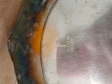 piatto di Sheffield, con tagliere di legno. 32 cm. mai usato, piccola macchia di ossidazione, segni del tempo