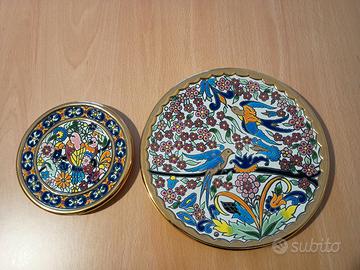 Piatto da parete di artigianato spagnolo (Siviglia) dipinto a mano con smalti colorati e finiture in bagno d'oro 24 k, diametro cm 14. Pezzo singolo 18 €, il set due piatti 44. Si assicura imballaggio accurato.