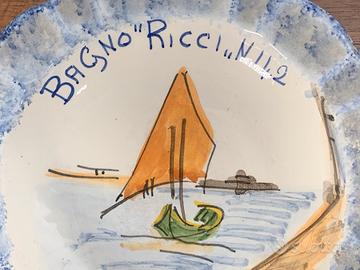 Piatto maiolica anni 90 che il bagnino donava al cliente che villeggiava l’intera stagione. Oggi impensabile.. fatto e dipinto a mano da cooperativa riminese.