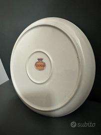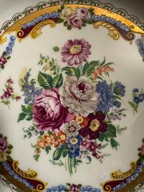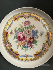 Elegante piatto in pregiata porcellana bianca di Limoges con decorazione floreale centrale e raffinati bordi in oro zecchino. Il decoro è stato realizzato in Italia dalla ditta DEPOS con tecnica esclusiva. L'oggetto è in ottime condizioni, senza sbeccature e con i dettagli dorati ben conservati. Ideale come pezzo da collezione, espositore o per arricchire una tavola classica.