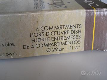 In ottimo vetro resistente, piatto antipastiera di portata a 4 scomparti della VMC France. Ottimo per sottaceti e piccole porzioni. Misure cm 29 x 19 per 3. Perfetto stato. Consegna diretta o spedizione al costo postale.