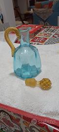 in cristallo colorato superficie delicatamente ondulata il manico ritorto in un luminoso giallo dorato il tappo lavorato come una pietra preziosa Vetrerie di Empoli