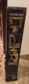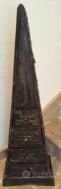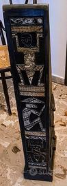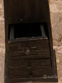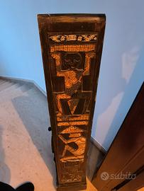 Piccola cassettiera in legno con affascinanti decori in stile egiziano. Dettagli dorati e neri e motivi che richiamano l'arte egizia.
