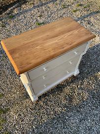 Vendo una cassettiera stile rustico shabby style, tre cassetti. Misure 63 cm, altezza 64 cm larghezza 32,5 cm profondità