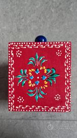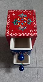 un grazioso oggetto dipinto a mano con colori vivaci ed è arricchita da tipiche decorazioni indiane. la struttura è dotata da 2 simpatici cassettini in ceramica con pomelli. i cassetti sono dotati di un fermo x non farli cadere.