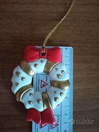 Decorata in rosso e oro, questa piccola ghirlanda color avorio ha un diametro di circa cm 7 e raggiunge una lunghezza di cm 9.