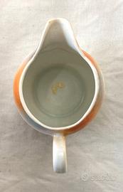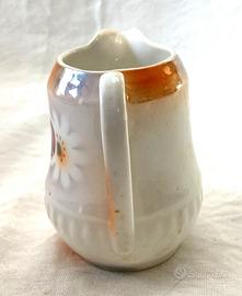 Piccola lattiera/bricco da latte in ceramica smaltata, con decorazione floreale e delicate sfumature perlate nei toni chiari.