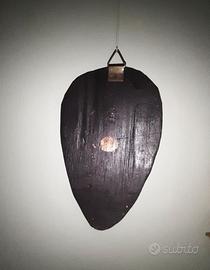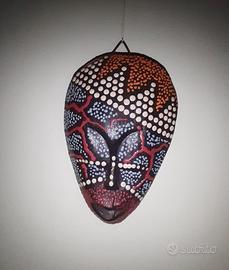 Piccola maschera decorativa in legno dipinta a mano con la tecnica del puntinato policromo. Sul retro presente il gancio per essere appesa.