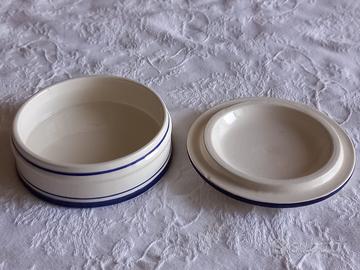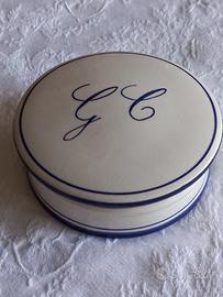 Scatola rotonda in ceramica con coperchio, decorata con le iniziali "GC" in blu e bordi blu sulla base e sul coperchio.