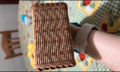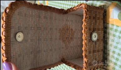 È probabilmente degli anni 50-60 impreziosita da un fiore di raso. Con evidente macchia di umidità visibile solo dall’interno. Sembra formata da stecchette di bambù.