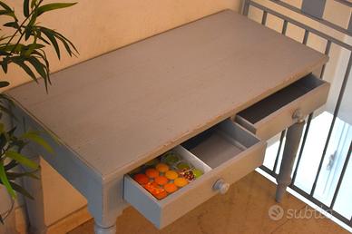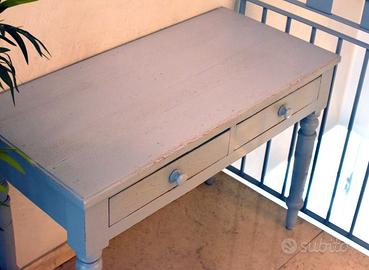 Vendo piccola scrivania-tavolino in legno massello stile "provenzale", colore grigio-azzurro, dotata di 2 cassetti come da foto. Dimensioni: 106,5x50x75 cm (LxPxH). Solo consegna a mano.