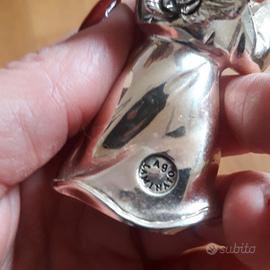 Piccola statuina di angelo che suona il flauto laminata argento.