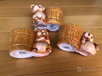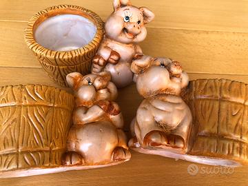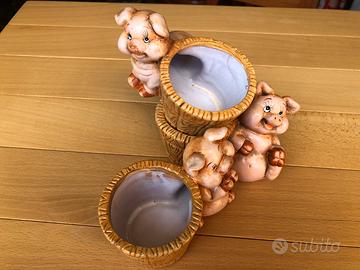 Sono 3 vasetti piccoli con maialini che possono essere utilizzati per penne o una piantina che farebbe compagnia a questi simpatici maialini . L’apertura della bocca del vaso e’ di cm 5,8